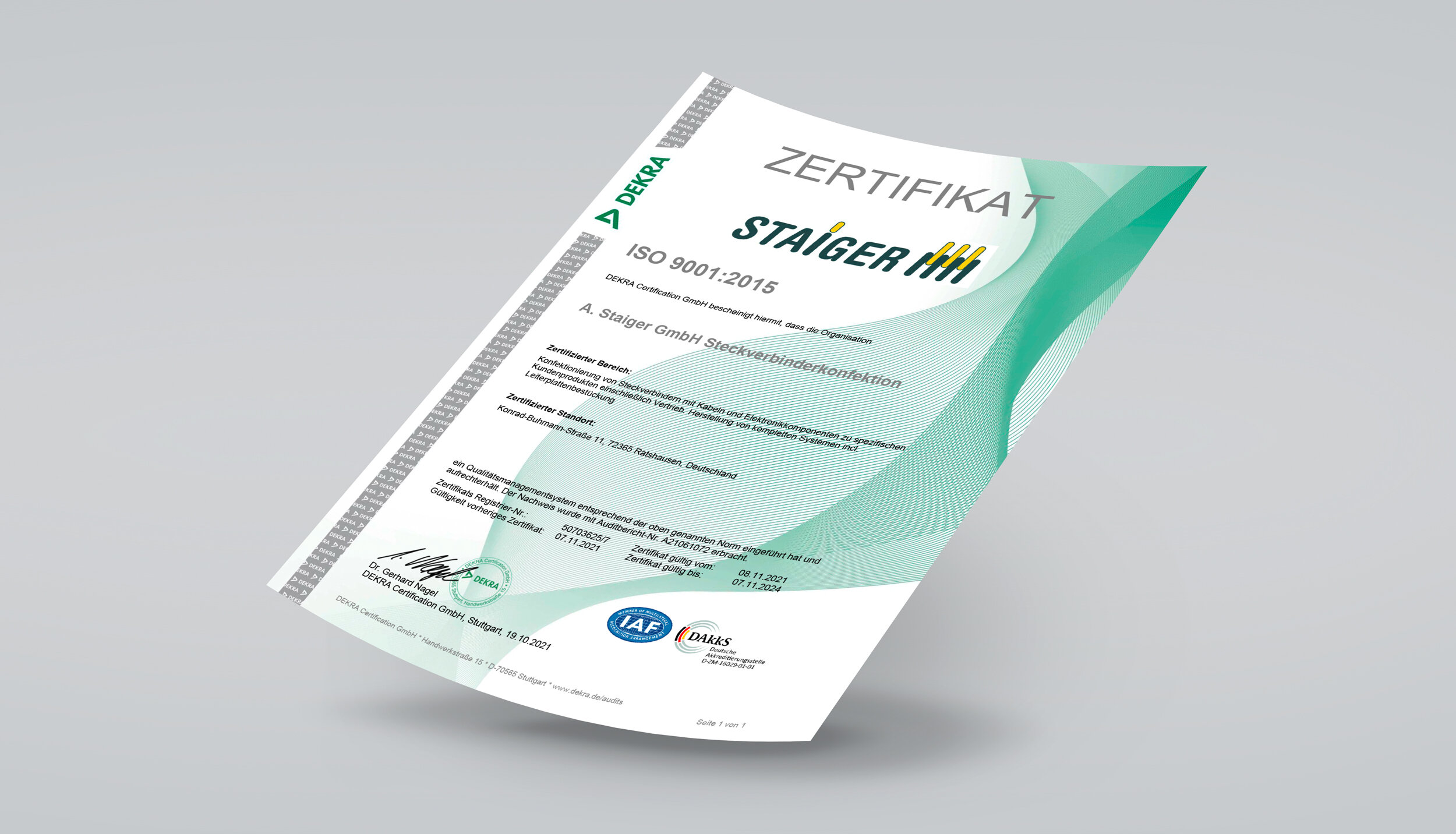 Staiger sichert Qualität mit einem lückenlosen QS-System nach DIN EN ISO 9001:2015, mit einer 100-Prozent-Prüfung auf Durchgang und Kurzschluss sowie Arbeitsmappen für jedes Projekt. Spezielle Test- und Messverfahren sowie regelmäßige Schulungen unserer MitarbeiterInnen und ein transparentes Informationssystem sorgen für die erstklassige Qualität unserer Lösungen.